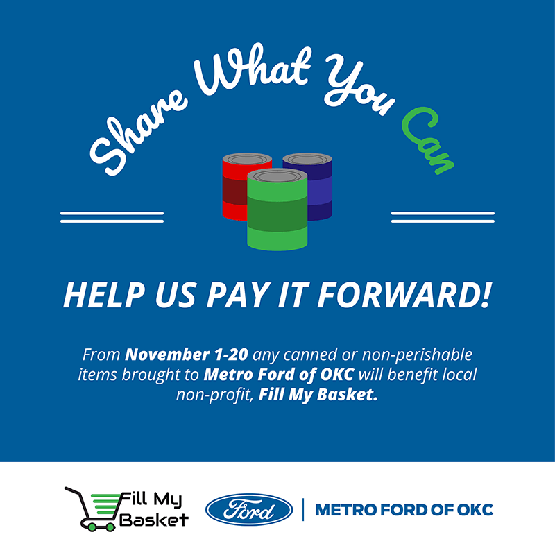 This November, 2018, we invite our community to bring canned goods and basic supplies (water, deodorant, shampoo, etc.) to our dealership. We will be contributing by more than just hosting the drive. Our staff members and Metro Ford of OKC will donate too. Our goal is to fill up the back of one of our favorite ford trucks, so we need all the help we can get!